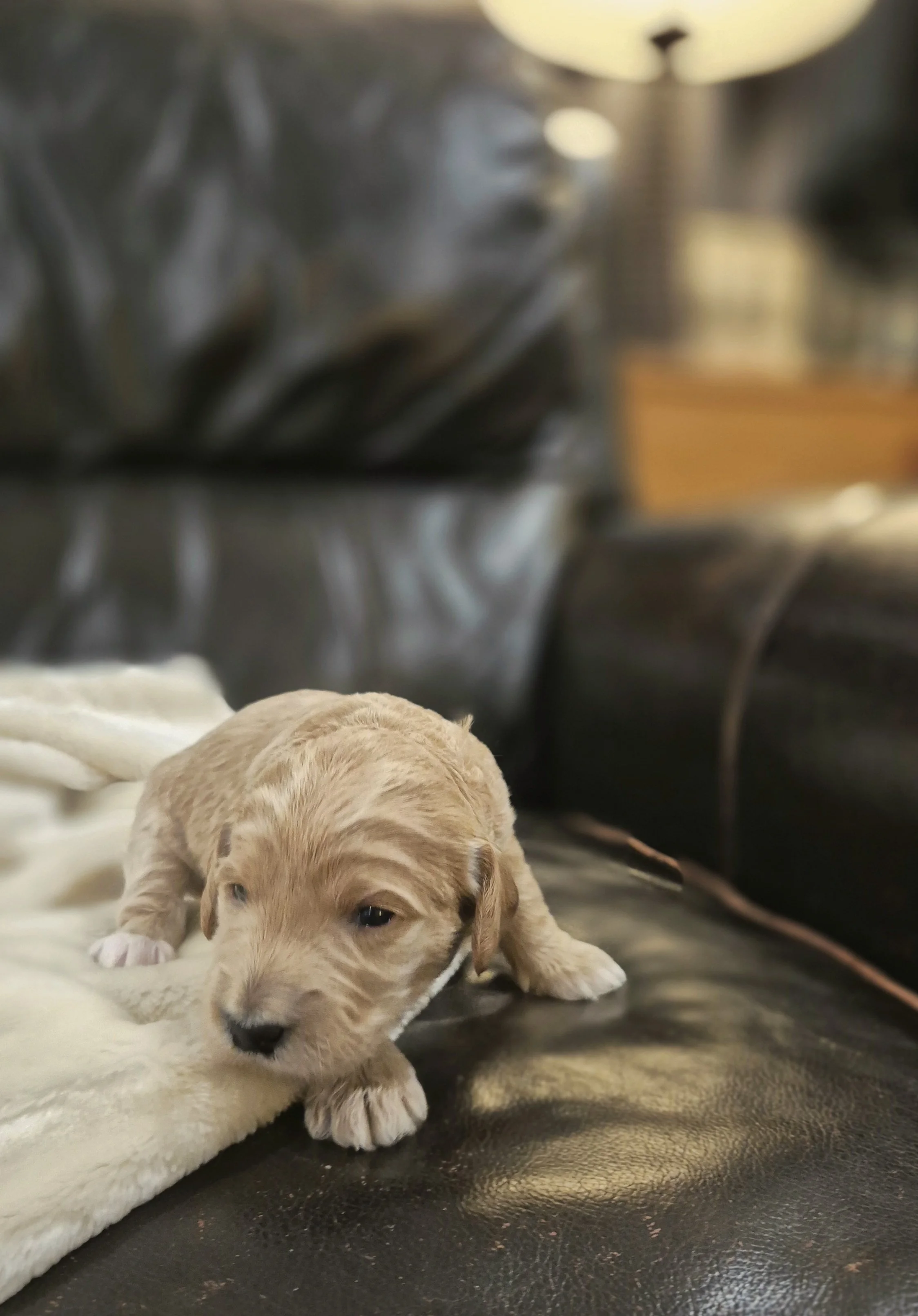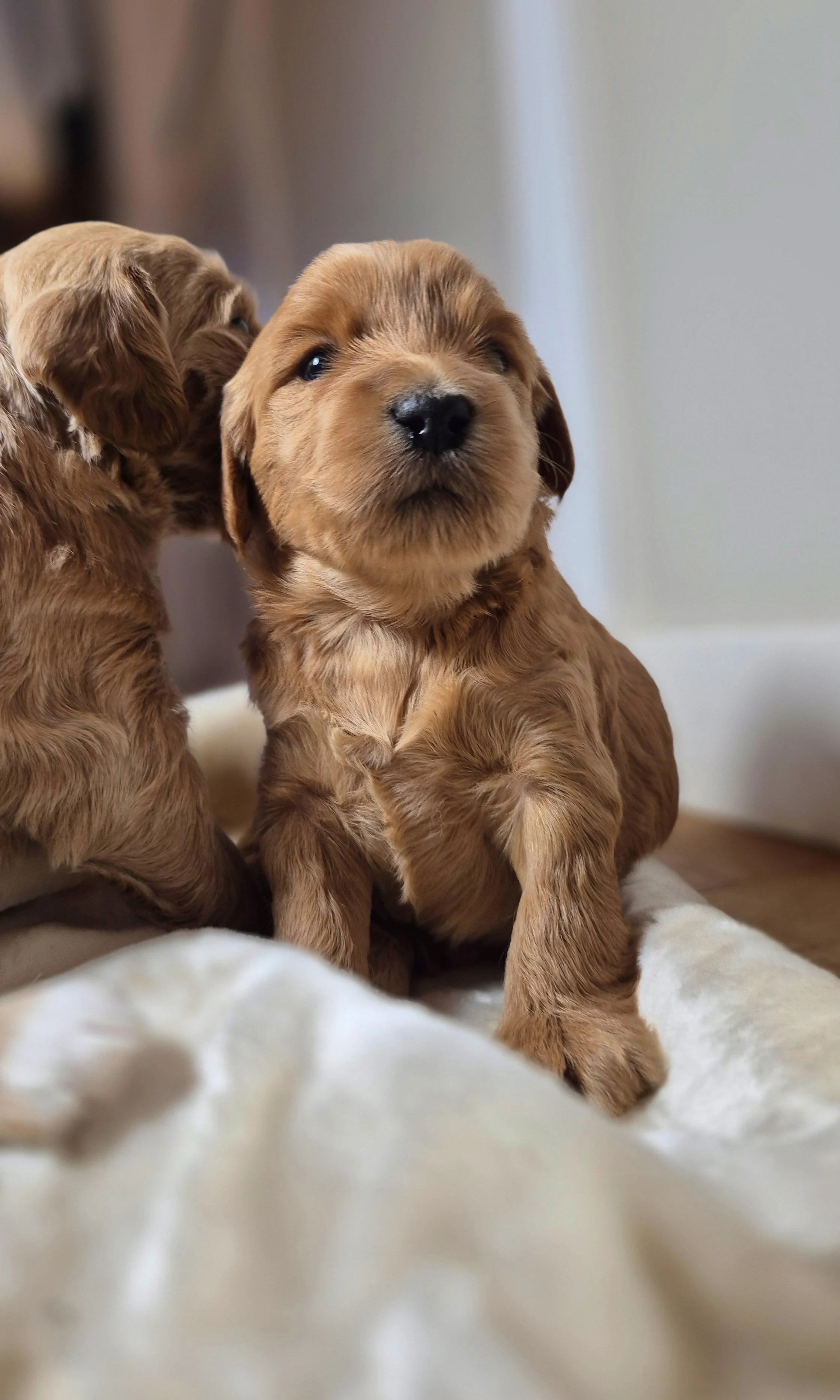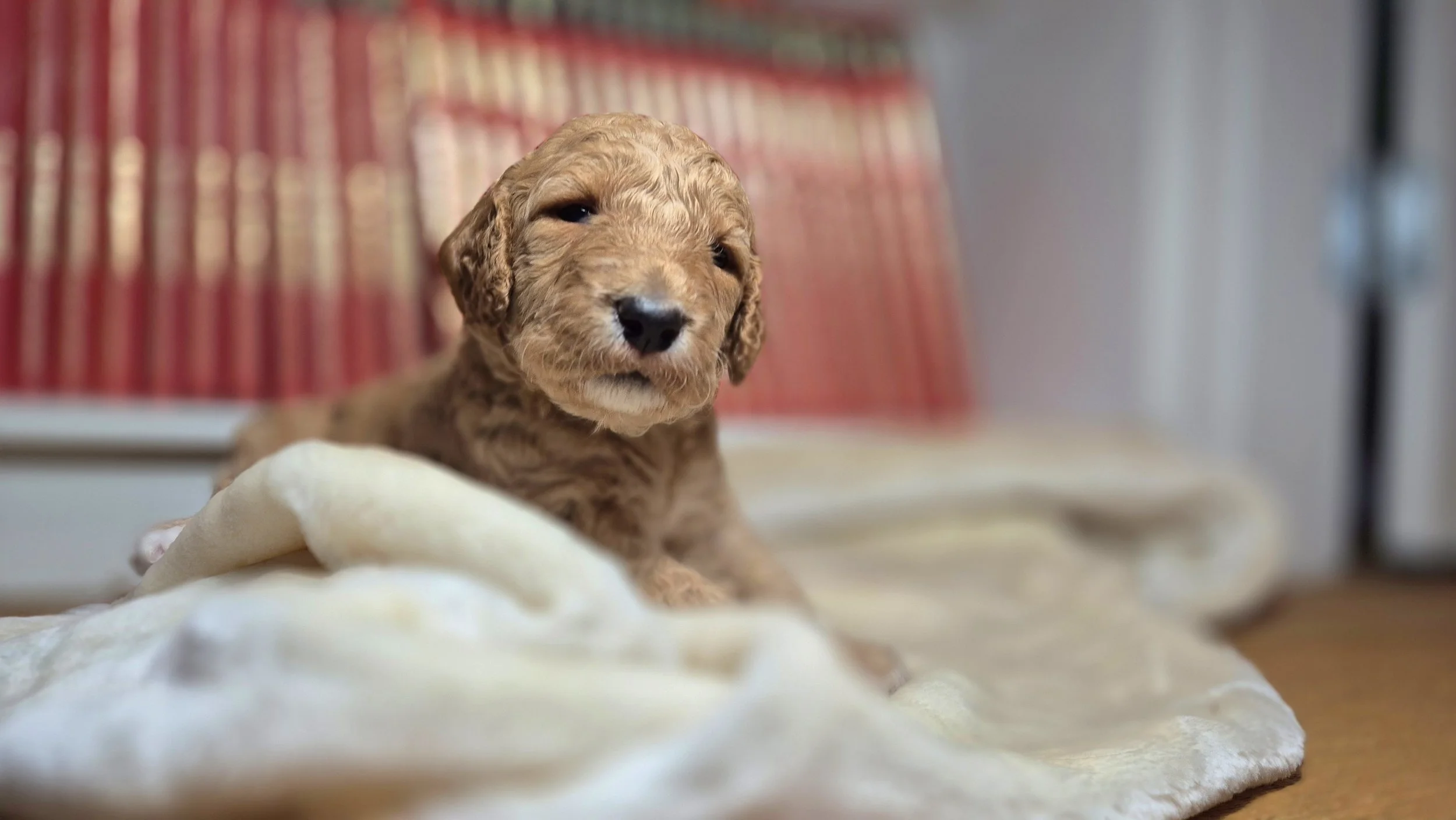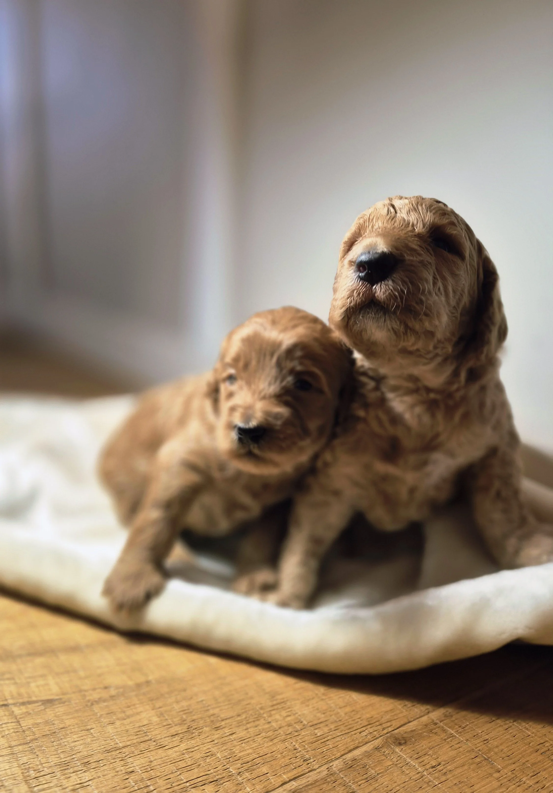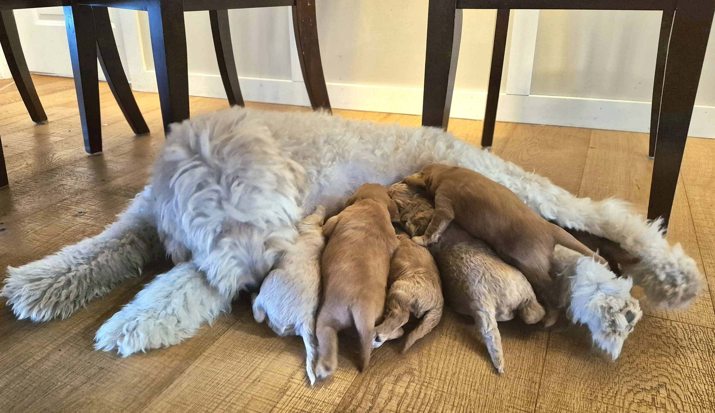 The Mother, Peaches, is a fun, attentive and affectionate, 30 pound, F2b Golden Doodle. Her soft wavy cream fur has a hint of apricot accents.