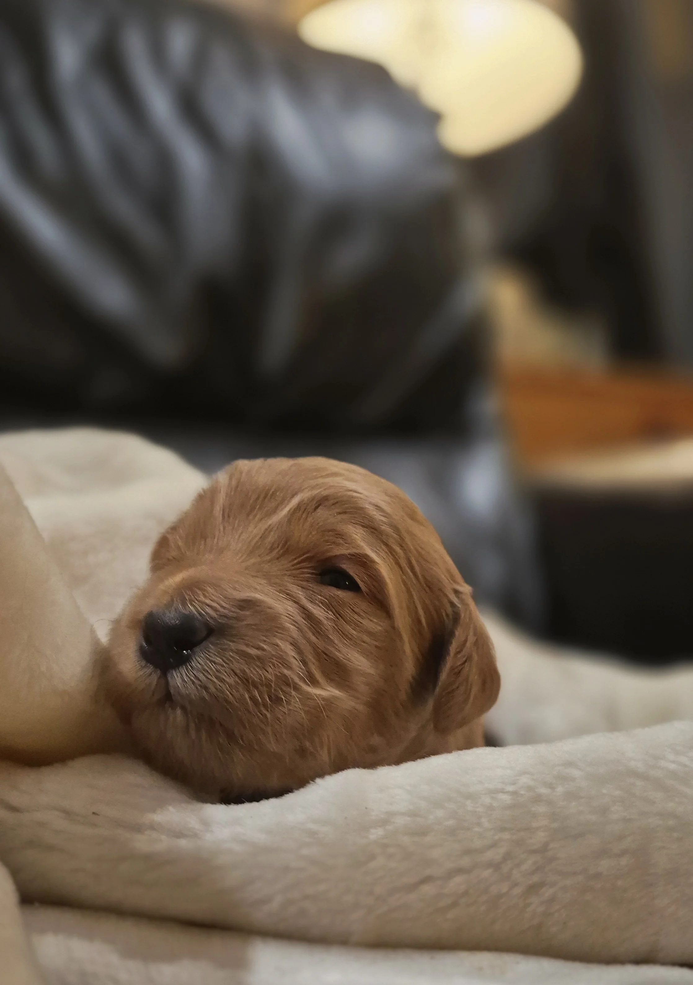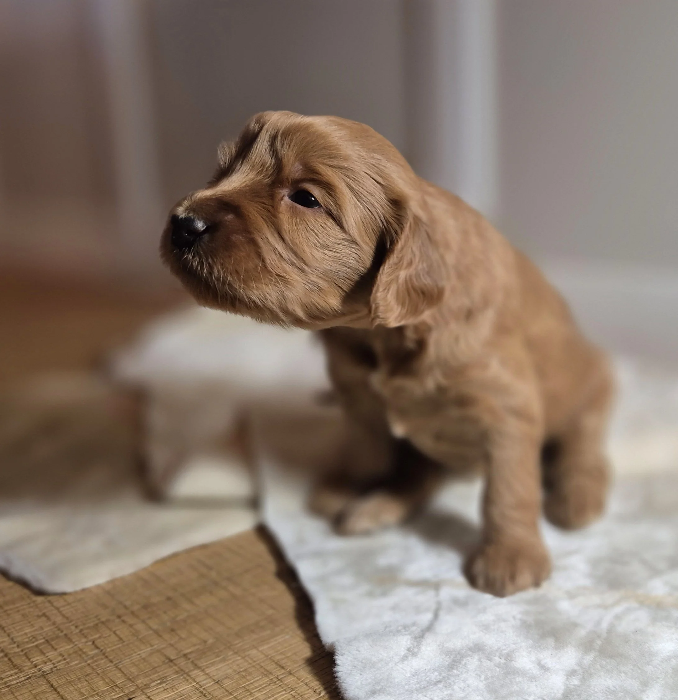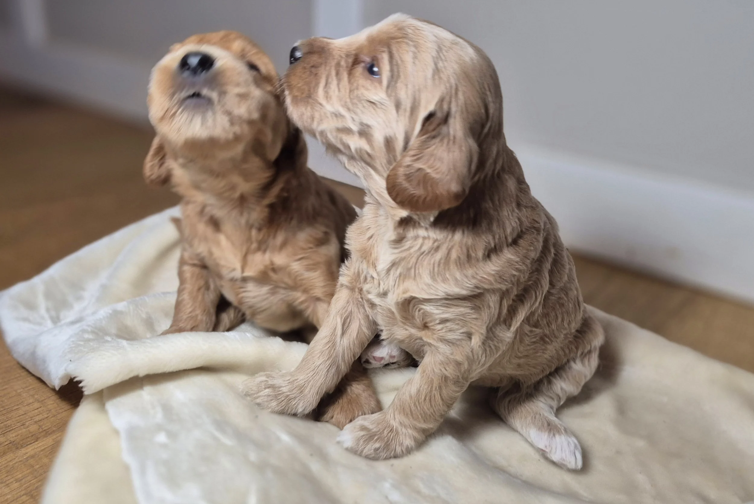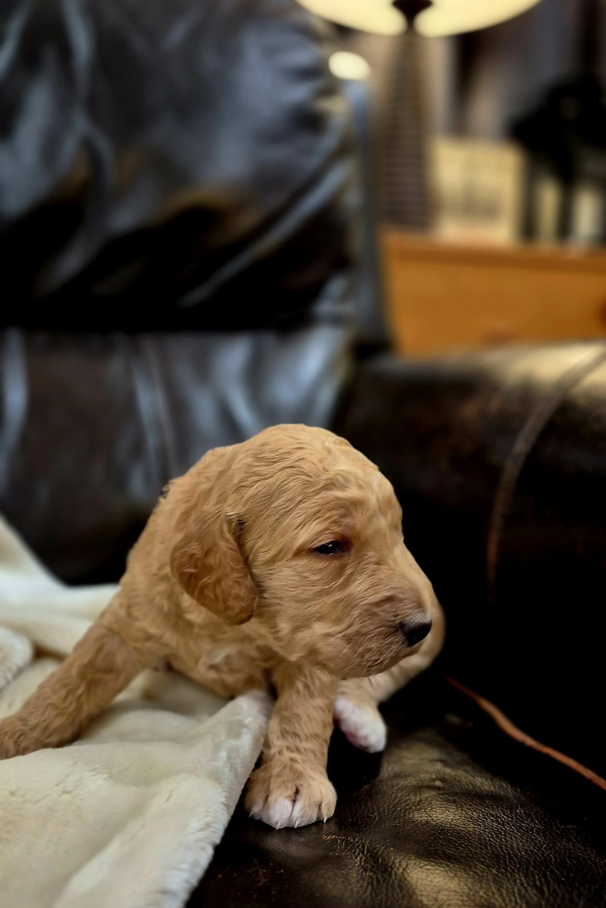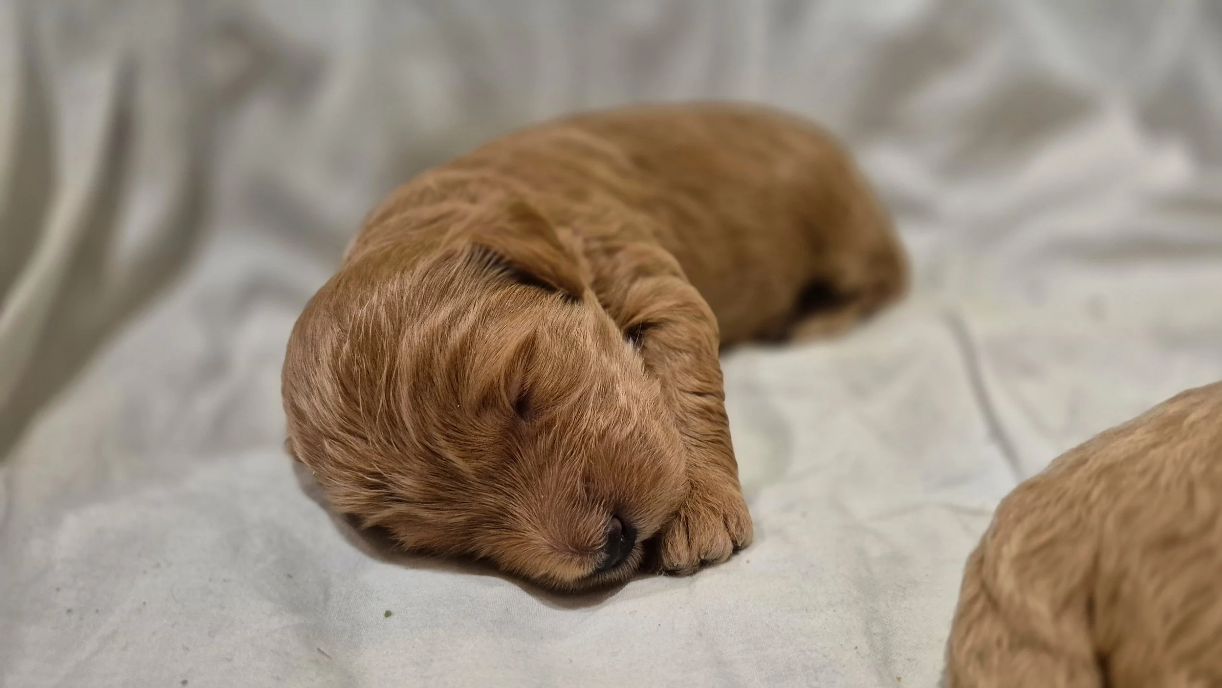 The Mother, Peaches, is a fun, attentive and affectionate, 30 pound, F2b Golden Doodle. Her soft wavy cream fur has a hint of apricot accents.